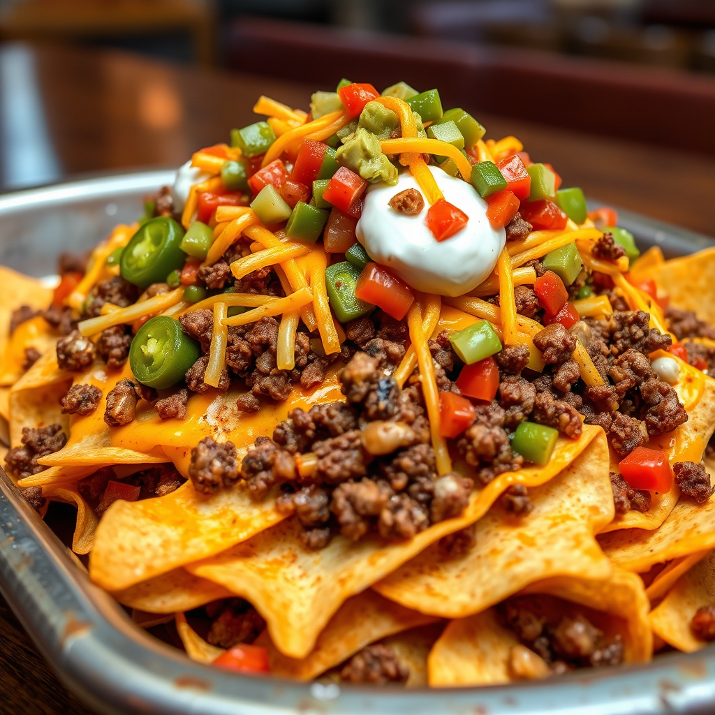A mountain of tortilla chips loaded with savory toppings and melted cheese.